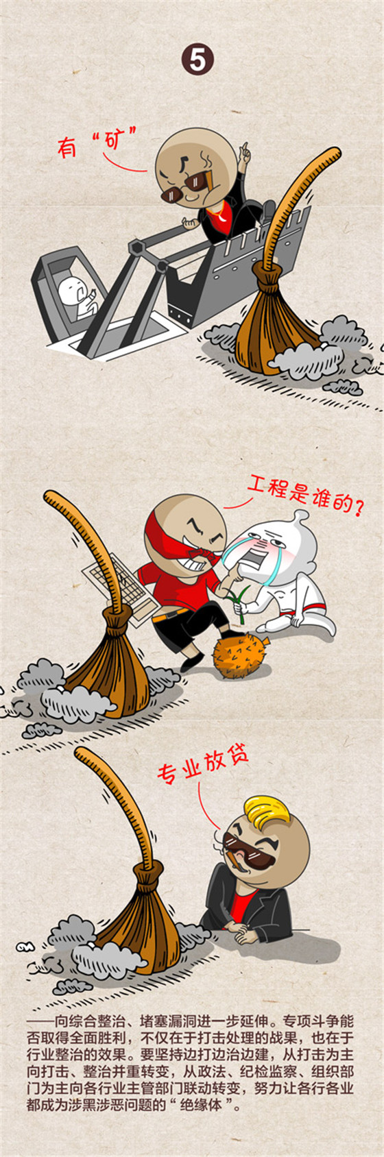 中央紀委國家監(jiān)委網(wǎng)站近日發(fā)布一組題為《2019掃黑除惡“六個延伸”》的漫畫,對2019年掃黑除惡專項斗爭提出向偵破大案、打財斷血進一步延伸,向網(wǎng)絡空間、新興領域進一步延伸,向深挖幕后、打傘破網(wǎng)進一步延伸,向依法懲治、快訴快判進一步延伸,向綜合整治、堵塞漏洞進一步延伸,向固本強基、鏟除土壤進一步延伸等六大方向。
