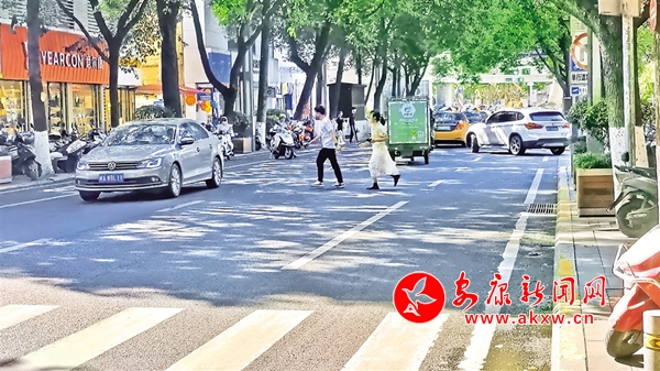 6月22日,安康中心城區(qū)金州南路,行人橫穿馬路,不走斑馬線。(記者 吳單 攝)