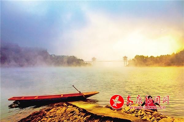 湖抱山,山擁湖,從天柱山上鳥瞰,晨看日出,霞光萬道,暮觀日落,湖光瀲滟,尤其是雨后放晴觀云海,輕煙薄霧,縹緲迷離,搖曳于峰之巔,彌漫在宇之殿,疑是凡人撞入九霄。水縹緲無垠,湖光鏡面,山綿延有致,翡翠如黛,宛如綠寶石鑲嵌。