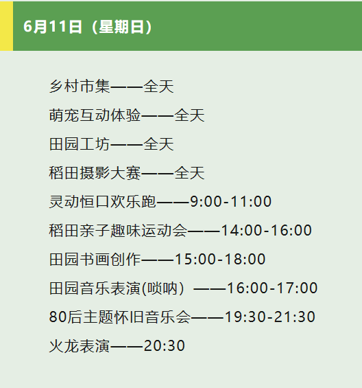 當日,現(xiàn)場還舉辦了稻田拔河、稻田摸魚、稻田摔跤等娛樂活動和田園古箏表演、70后主題懷舊音樂會、火龍表演等演出活動,吸引眾多游客朋友前來打卡。6月11日,靈動恒口歡樂跑、親子趣味運動會、嗩吶音樂表演、80后主題懷音樂會等活動精彩繼續(xù)......?
