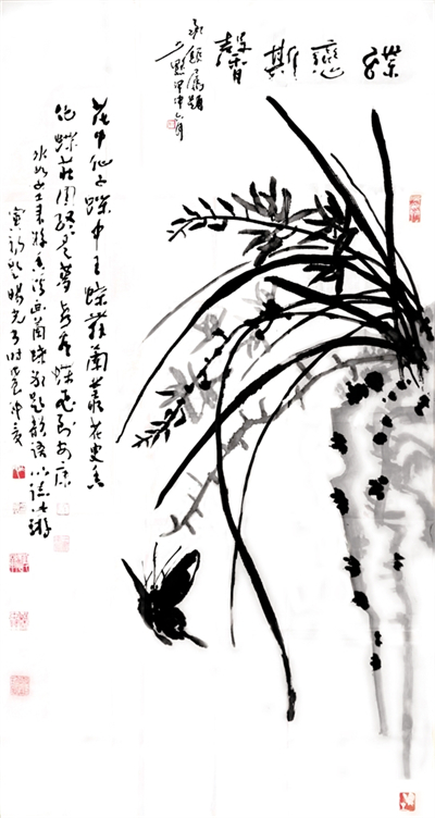 1988年,中國(guó)畫(huà)壇號(hào)稱“蝶王”的王冰如女士,以80歲高齡回到她曾工作生活10年之久的第二故鄉(xiāng)安康舉辦畫(huà)展,并且以詩(shī)書(shū)畫(huà)會(huì)友,特邀旸光先生和金州著名詩(shī)人劉寅初老人同游香溪,冰如老師興之所至,巧繪墨蝶,說(shuō)道“人言寅初老弟有曹子健七步成詩(shī)之才,今日以十步為限,將此畫(huà)為題,賦詩(shī)一首,旸光老弟書(shū)于其上如何?”寅初老只走了三步便道有了,于是順口吟誦,旸光先生揮毫急就“花中仙子蝶中王,蝶舞籣叢花更香,化蝶莊周終是夢(mèng),喜看蝶王飛安康?!币还P流暢的行草躍然于畫(huà)上,相輔相成,真是詩(shī)情畫(huà)意天作之合。一幅難遇難得難覓的“三絕圖”誕生了。冰如老師感慨萬(wàn)千,說(shuō)到“二位弟臺(tái)才高八斗,只可惜待在安康這個(gè)貧瘠的地方被埋沒(méi)了也!”這個(gè)場(chǎng)面是一種巧合,正是旸光先生“萬(wàn)事隨緣”的結(jié)晶,爾后經(jīng)書(shū)壇大家陳少默先生為之題跋做款,更是錦上添花,成了四絕圖。冰如、少默、旸光、寅初先生已然作古,這段翰墨丹青之情,將永存世間傳為藝術(shù)佳話。