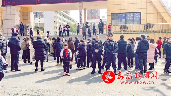 開學(xué)當(dāng)天,民警在校園門口值守。