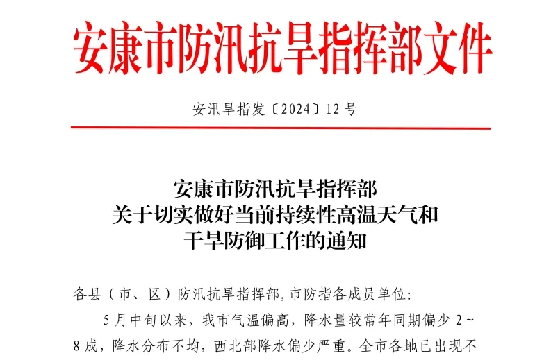 6月12日,安康市防汛抗旱指揮部發(fā)布《關(guān)于切實做好當(dāng)前持續(xù)性高溫天氣和干旱防御工作的通知》。