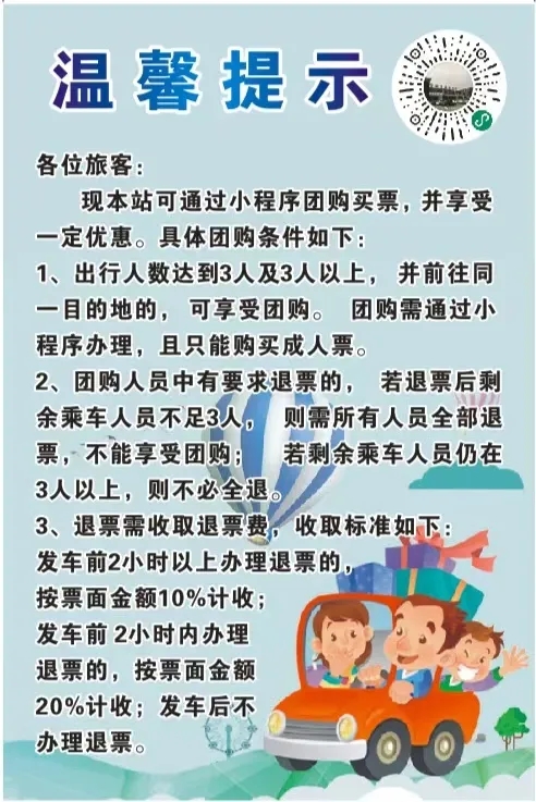 新增團購小程序,目前開啟安康——紫陽團購票,紫陽全程68公里,途經(jīng)包茂高速,運行大約1小時。票價最低20元起,三人可成團,購票更優(yōu)惠!下方圖片內(nèi)二維碼可快速購買。