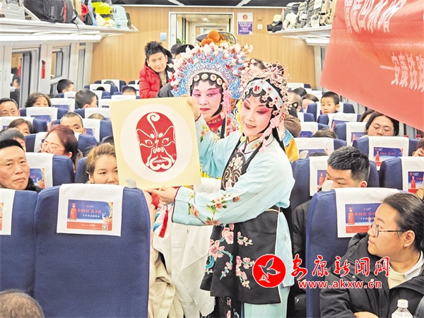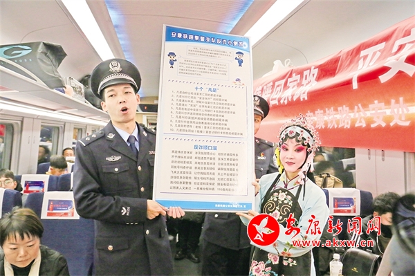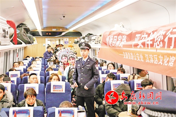 火車穿越秦巴山水間,途中,來自安康漢調二黃研究院的專業(yè)演員和地方民間漢調二黃愛好者們一同表演了國家級非物質文化遺產——漢調二黃經典戲曲演唱,并為旅客們講解漢調二黃戲曲知識,與旅客們開展互動交流,讓旅客親身體驗漢調二黃戲服道具,感受漢調二黃的獨特藝術魅力。來自漢濱區(qū)文化館的漢濱剪紙技藝傳承人為旅客們展示講解了安康市級非物質文化遺產——漢濱剪紙技藝,向參與互動的旅客送上了親手創(chuàng)作的漢濱剪紙作品,提前送上新春祝福?;顒又校靼茶F路公安局安康公安處的民警們和文藝工作者們一同宣傳普及了反詐知識,進一步提升旅客的安全防范意識。