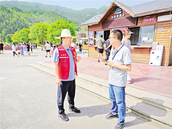 游客需要什么,黨員就做什么!今年“五一”期間,全鎮(zhèn)設(shè)立4個固定服務(wù)崗、30個流動服務(wù)點,配備2支摩托巡邏隊和200名志愿者,形成“點線面”結(jié)合的服務(wù)網(wǎng)絡(luò)。同時運用“智慧監(jiān)管云平臺”,整合無人機巡查、AI人流監(jiān)測等技術(shù)手段,實現(xiàn)景區(qū)客流精準調(diào)控,贏得了廣大游客的爭相稱贊。