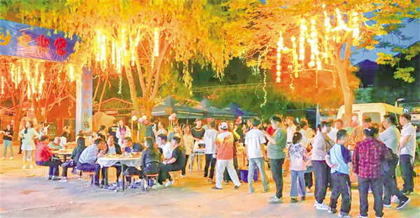 活動現(xiàn)場,本土樂隊、游客與特邀嘉賓輪番登臺,民謠、搖滾、電子樂交織回蕩。游客們圍著篝火載歌載舞,火光映紅張張笑臉?,F(xiàn)場設(shè)置的文創(chuàng)產(chǎn)品和小龍蝦、燒烤等特色美食攤位更是滿足了游客的多重體驗。