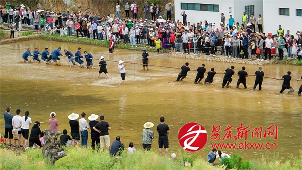插秧比賽后緊接著開展了拔河比賽,參賽者們光著腳在泥濘的田里奮力拉扯,你來我往,互不相讓,田邊的觀眾則奮力地為自己支持的隊伍加油鼓勁。稻田抓鴨捕魚活動讓現(xiàn)場氣氛更加熱烈,觀眾紛紛脫下鞋襪,卷起褲腿,在稻田中追逐游魚和鴨子,歡快的笑聲此起彼伏。?