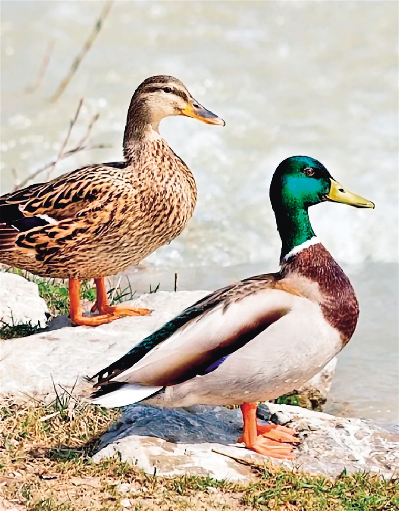 又名野鴨。雄鳥頭綠色,有一白色領(lǐng)環(huán),胸栗色,翼鏡藍(lán)綠色,尾上、下覆羽黑色,嘴黃綠色,腳橙紅色;雌鳥嘴橙黃色,貫眼紋黑褐色,全體褐色,有暗褐色斑紋。(來(lái)源:安康市林學(xué)會(huì))