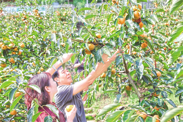 10月8日,游客在石泉縣城關(guān)鎮(zhèn)絲銀壩村脆甜柿子果園體驗(yàn)采摘樂(lè)趣。許兵 攝