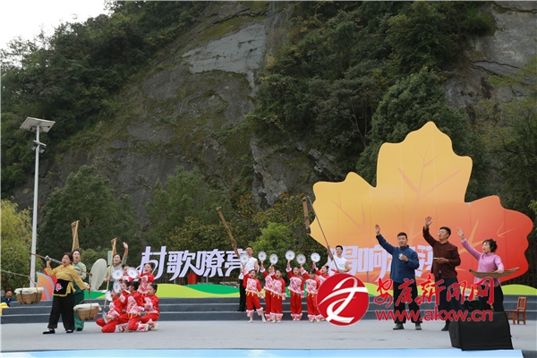 金秋時節(jié)的茨溝鎮(zhèn),萬畝紅葉、層林盡染。伴隨著歡快的鑼鼓聲,茨溝鎮(zhèn)、五里鎮(zhèn)、譚壩鎮(zhèn)三支隊伍輪番登場,不僅獻(xiàn)唱原創(chuàng)村歌,還展示特色產(chǎn)業(yè)、優(yōu)質(zhì)資源與地方文化,紛紛亮出獨(dú)具特色的“看家絕活兒”。歌伴舞《村歌飛揚(yáng)》《松壩謠》《幸福歌兒唱起來》唱出了鄉(xiāng)親們的幸福生活;以修建八一水庫為背景的安康歌謠《我來了》引發(fā)會場共鳴;民俗表演《龍的傳人》則將節(jié)目推向高潮。舞蹈、鄉(xiāng)村T臺秀、民俗表演、八岔戲等節(jié)目,或以傳統(tǒng)幽默詼諧的風(fēng)格,或以深情敘述的方式,展現(xiàn)鄉(xiāng)村新生活,為觀眾獻(xiàn)上一場別開生面的視聽盛宴,現(xiàn)場歡呼聲此起彼伏。