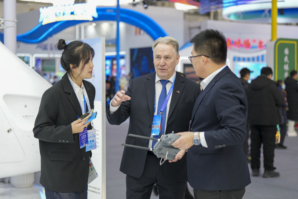 1月6日,在2026哈爾濱國際冰雪經(jīng)濟(jì)博覽會現(xiàn)場,參會嘉賓(中)在了解一款工業(yè)無人機的參數(shù)和性能。新華社記者 王松 攝