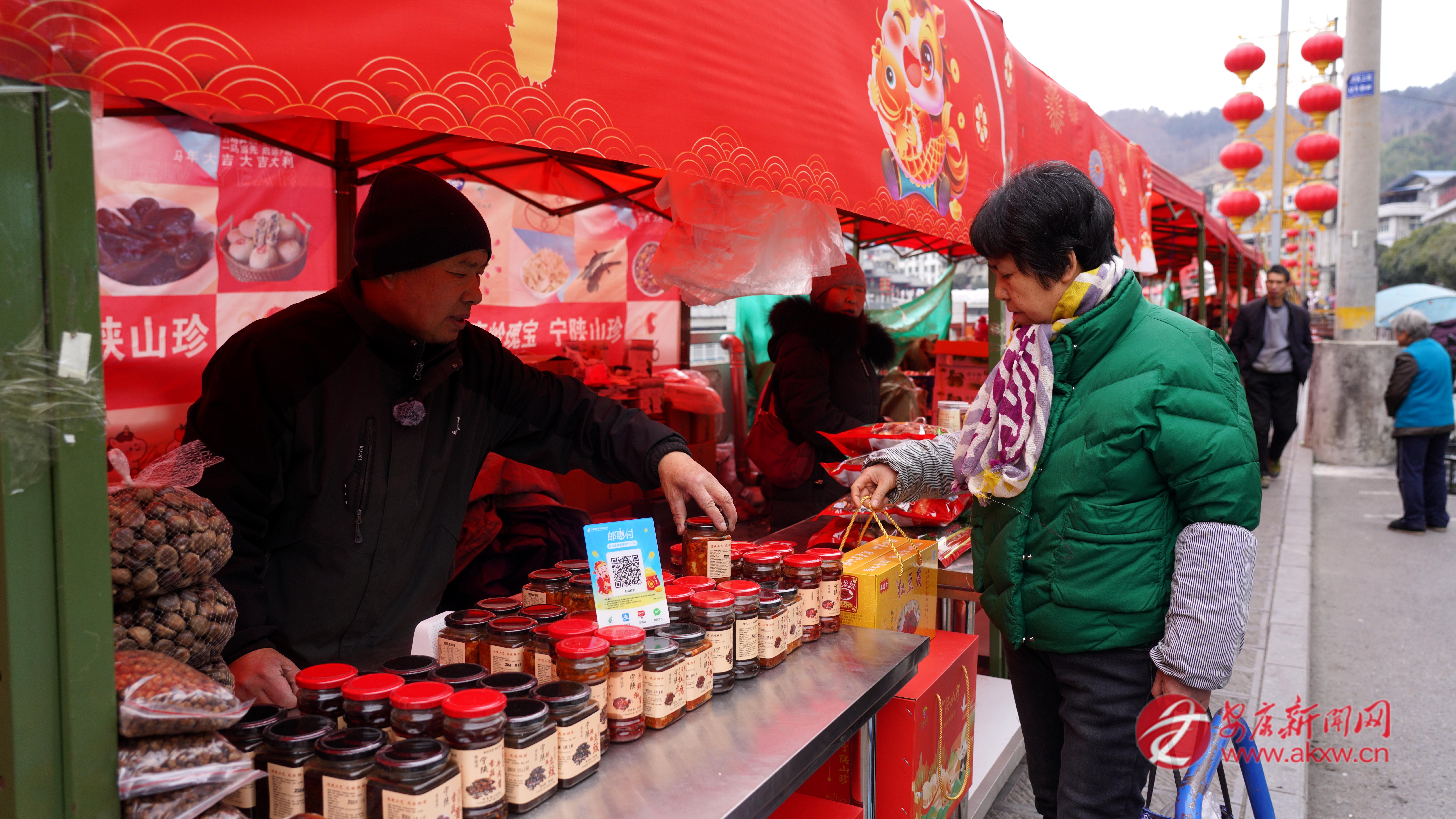 在寧陜縣城河堤?hào)|街的“年貨大集”,134個(gè)攤位整齊排布,本地臘肉油亮誘人、野生香菇厚實(shí)飽滿、土蜂蜜晶瑩剔透、木耳如墨玉般堆疊;新衣、玩具、春聯(lián)、中國(guó)結(jié)琳瑯滿目,一片喜慶祥和的景象。