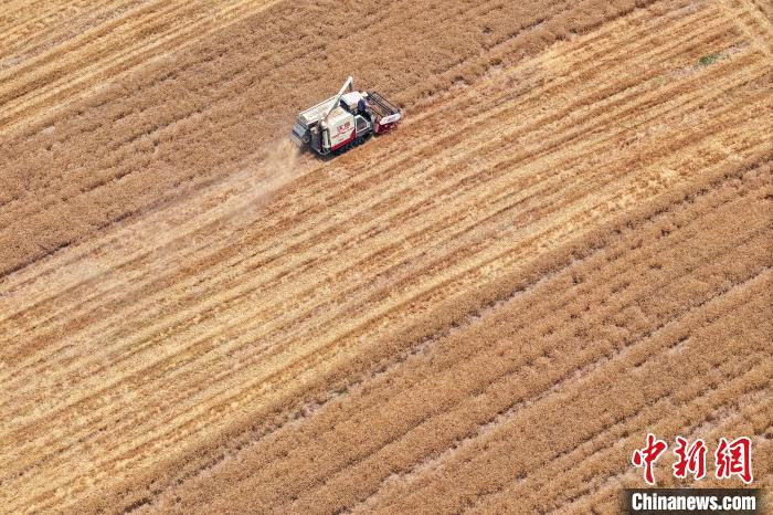 資料圖:江蘇南京,工作人員駕駛農機在江北一處田間收割小麥。(無人機照片)中新社記者 泱波 攝
