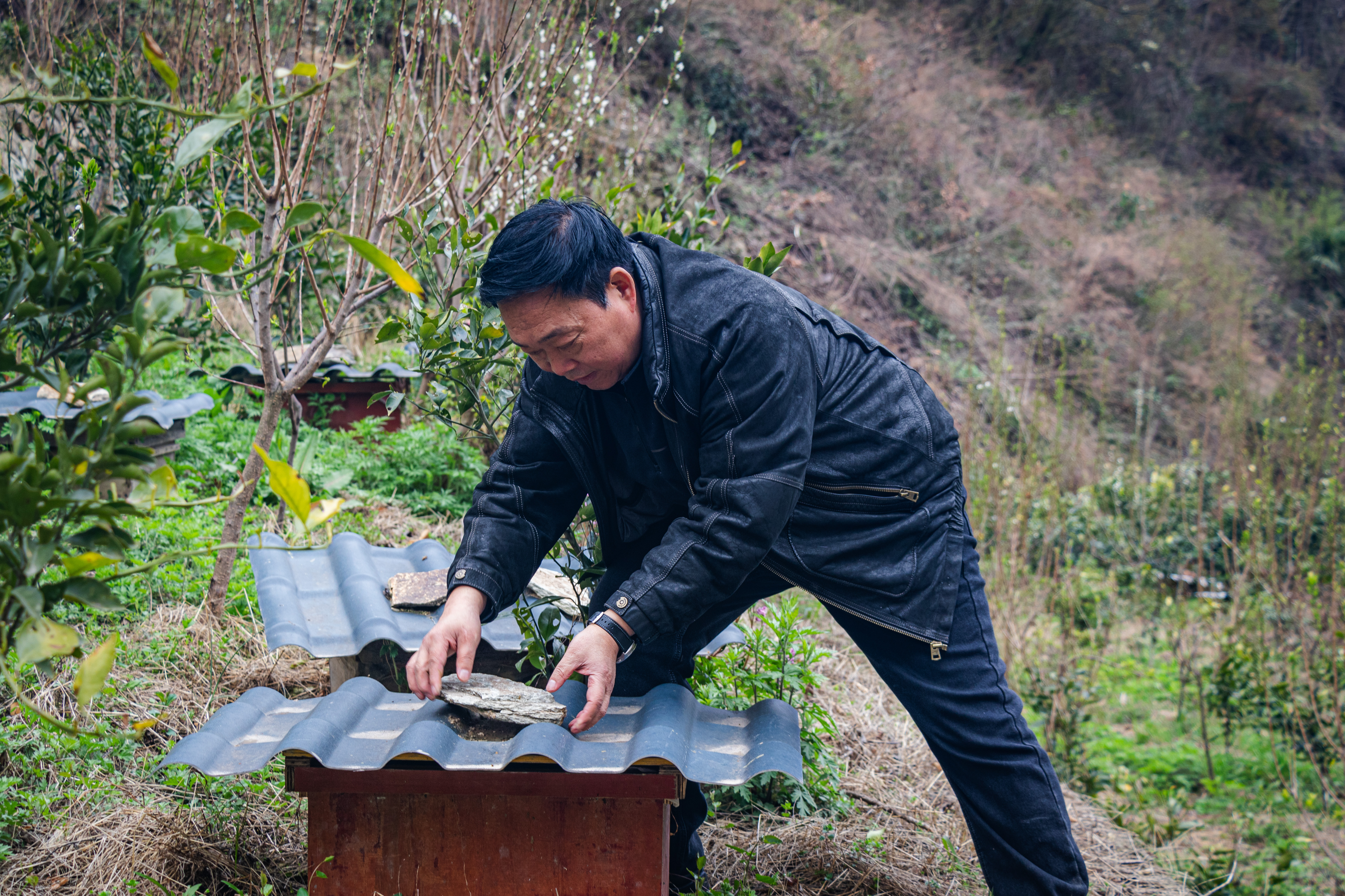 唐小明在檢查蜂箱