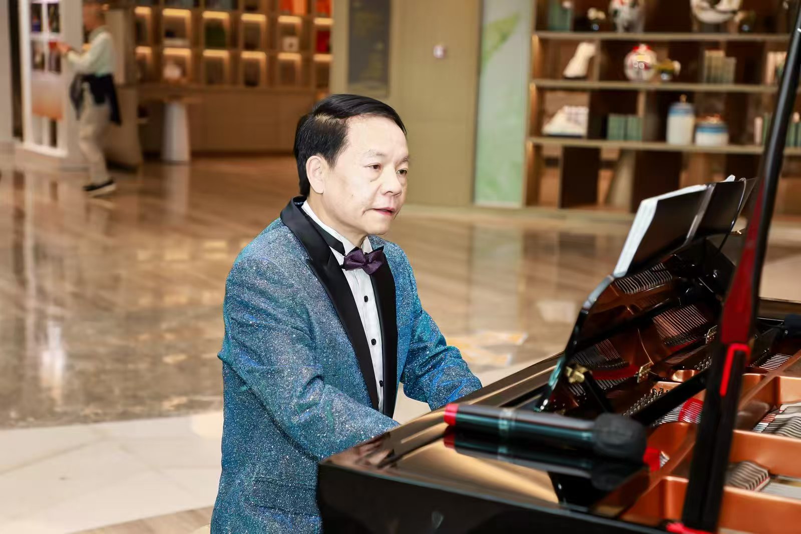 “第二點(diǎn),共鳴腔體?!彼檬种篙p點(diǎn)自己的胸腔、喉部、口腔、頭腔,“這四個(gè)位置,就是你的聲音工廠。聲音不是從嗓子里硬擠出來(lái)的,是共振出來(lái)的?!敝v到興頭上,他干脆現(xiàn)場(chǎng)示范了一段《草原之夜》的引子,高亢透亮的男高音在劇場(chǎng)中回蕩,每一個(gè)音符都清晰得如同落在耳畔。喝彩聲尚未平息,他又邀出他的學(xué)生、平利縣文化館館長(zhǎng)陳尚忠。師生二人即興合奏,琴聲與人聲交織,40余年的師生情誼在旋律中靜靜流淌。