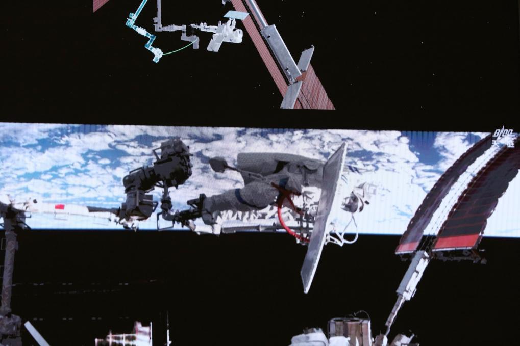 △這是2026年4月16日在北京航天飛行控制中心屏幕上拍攝的神舟二十一號乘組航天員武飛在艙外工作的畫面。