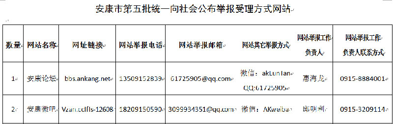 安康市第五批申報統(tǒng)一向社會公布舉報受理方式網(wǎng)站